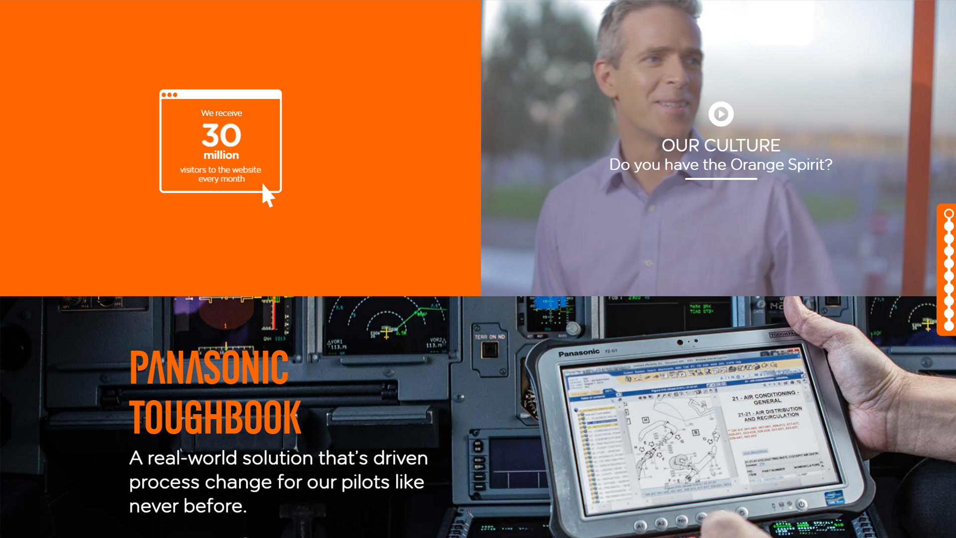 easyJet Careers Tech pageThe design below was one of my offered solutions. The design would break out from the blocky nature of most websites by utilising the easyJet 500 graphic. The page would include multiple interactive features - like the Google street view allowing the user to explore where on the ground and in the air easyJet Tech had made a difference. The plane in the middle of the page would have followed the user journey down the page, lifting off as they started learning more about easyJet tech and landing as they made the decision to apply.