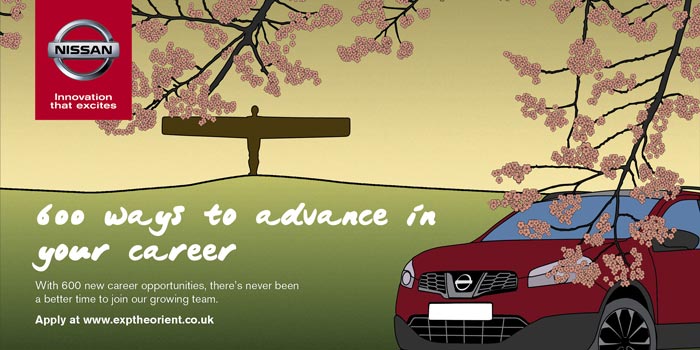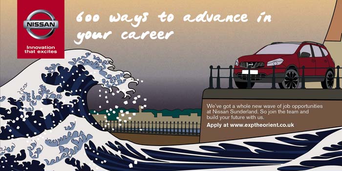 This one played on the unique mix of Japanese traditions and British inventiveness of the manufacturing process at Nissan Sunderland by showing the locations near the plant in the style of Japanese woodblock printing.